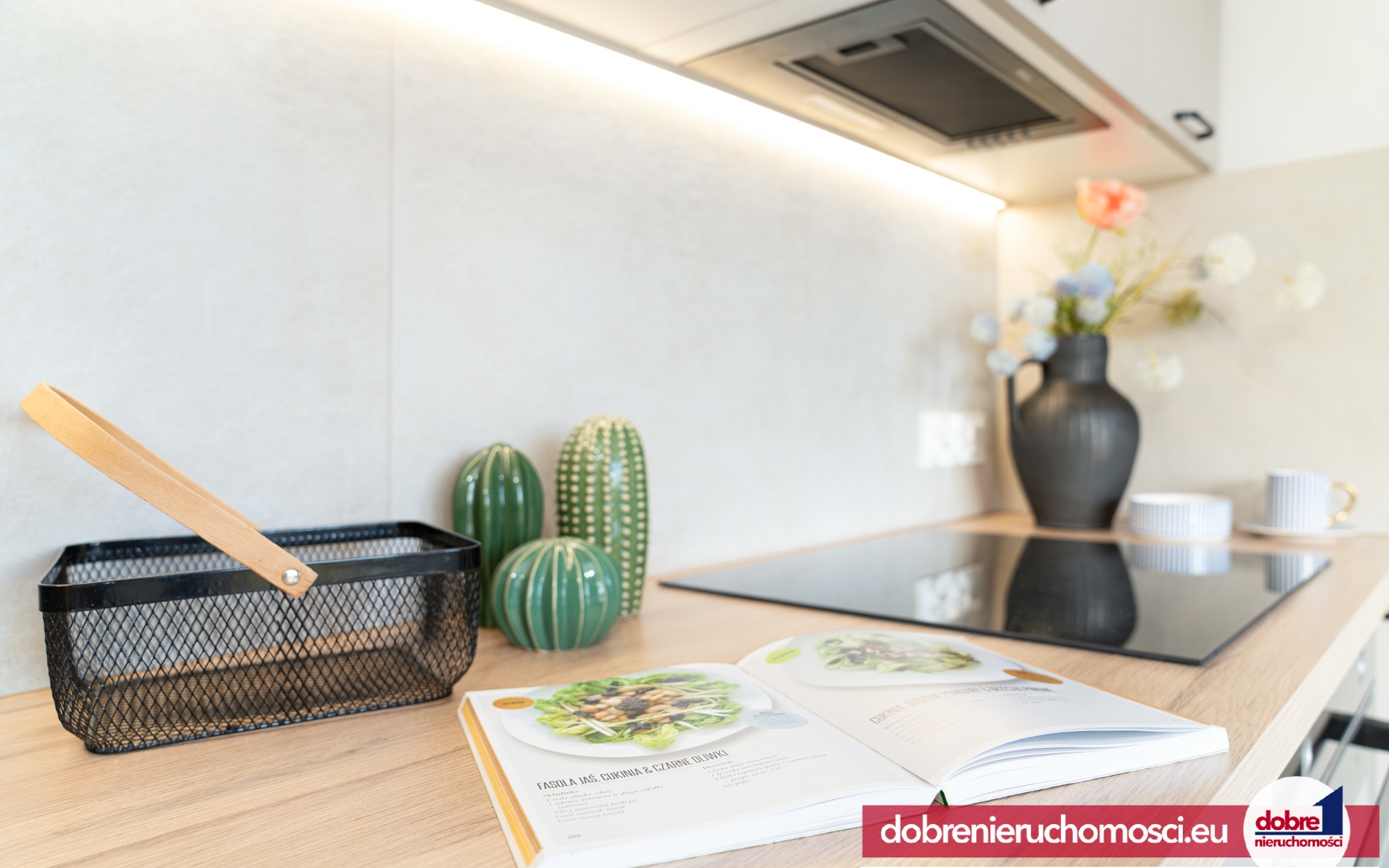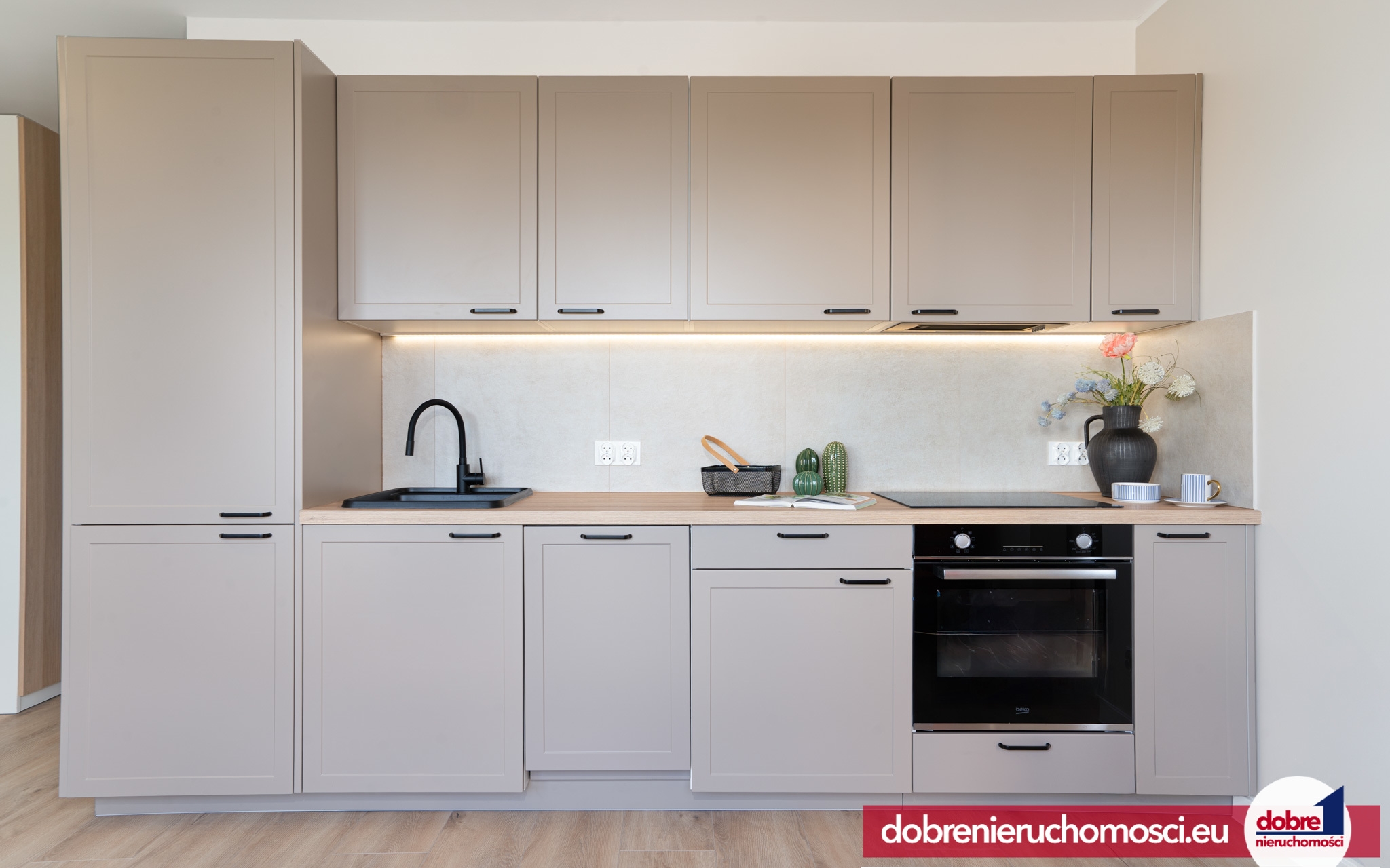 Nowa kuchnia z AGD (piekarnik, płyta grzewcza, wyciąg i zmywarka).