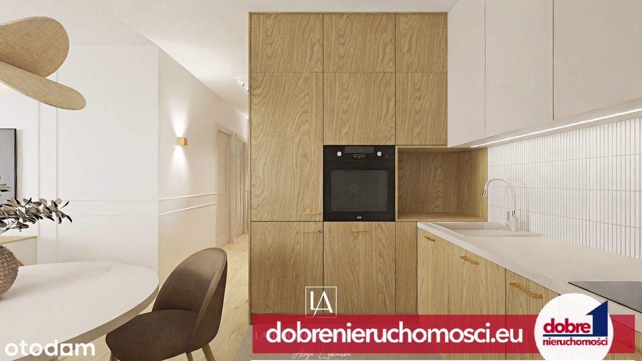 - Salon z aneksem kuchennym – jasny, funkcjonalny, z pełną zabudową stolarską na wymiar
