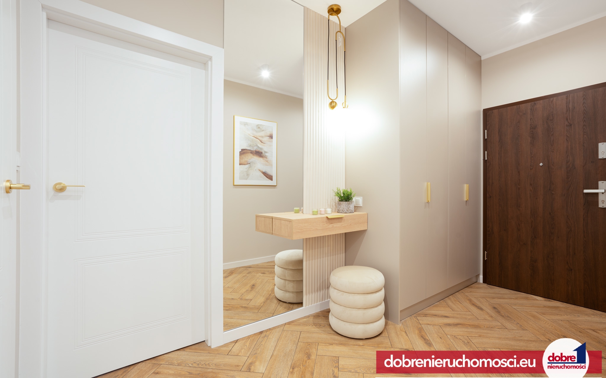 Przedpokój: lustrzana powierzchnia, która optycznie powiększa przestrzeń, oraz zabudowa szaf w jasnym kolorze, designerska konsola z oświetleniem w złotym kolorze i puf.