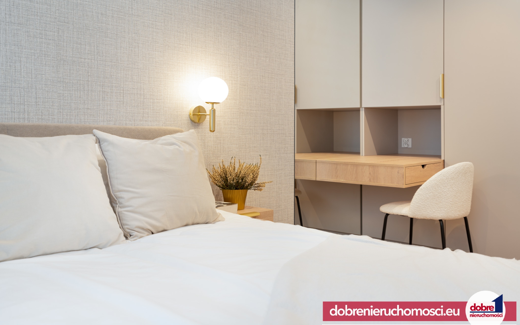 Sypialnia: Jasna i przytulna, z funkcjonalną zabudową meblową i kącikiem do pracy.