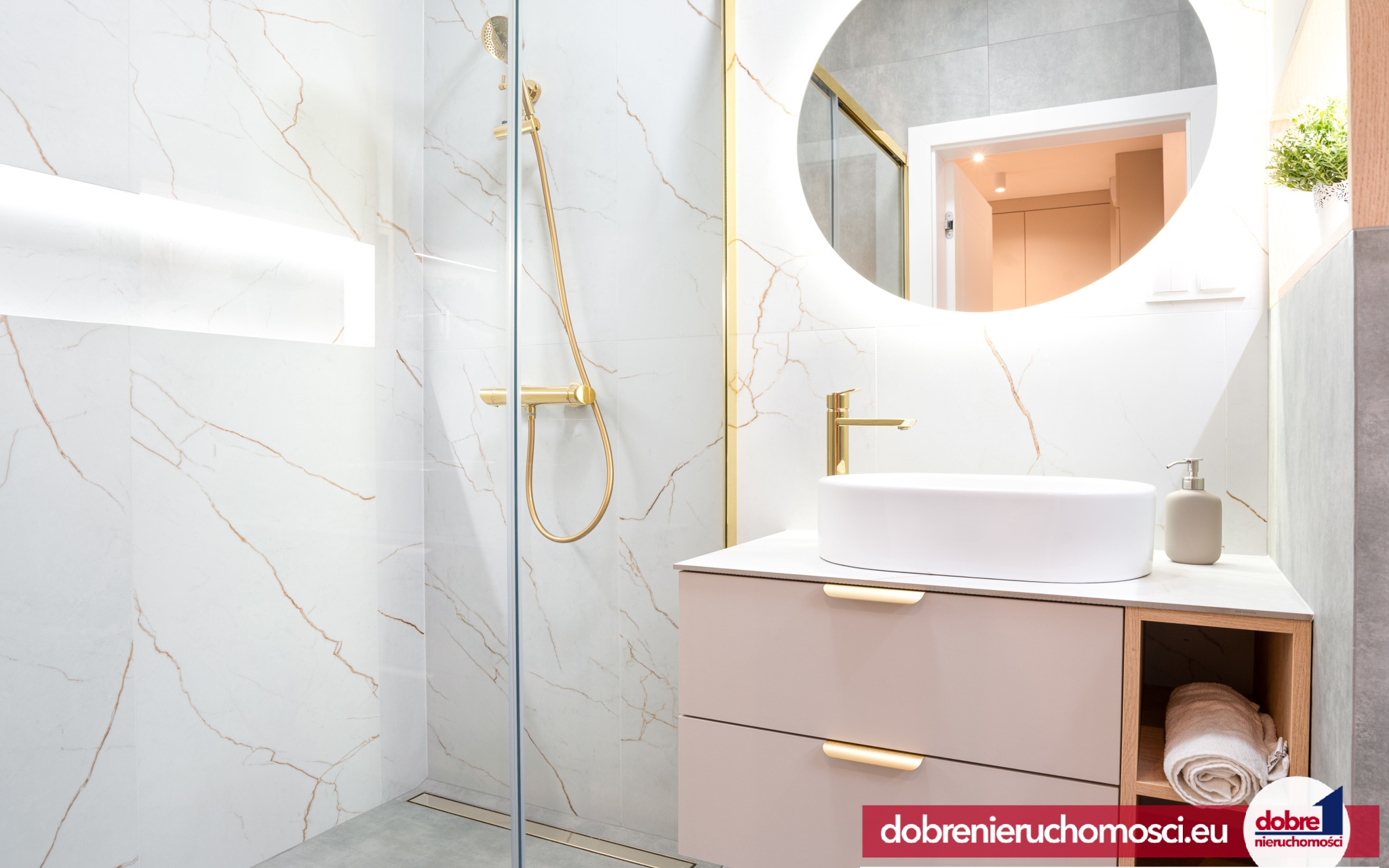 Łazienka: Wykończenie z białych płytek imitujących marmur ze złotymi żyłkami, kontrastujące z nowoczesnymi, szarymi płytkami. Złota, designerska armatura i podświetlane lustro tworzą strefę SPA.