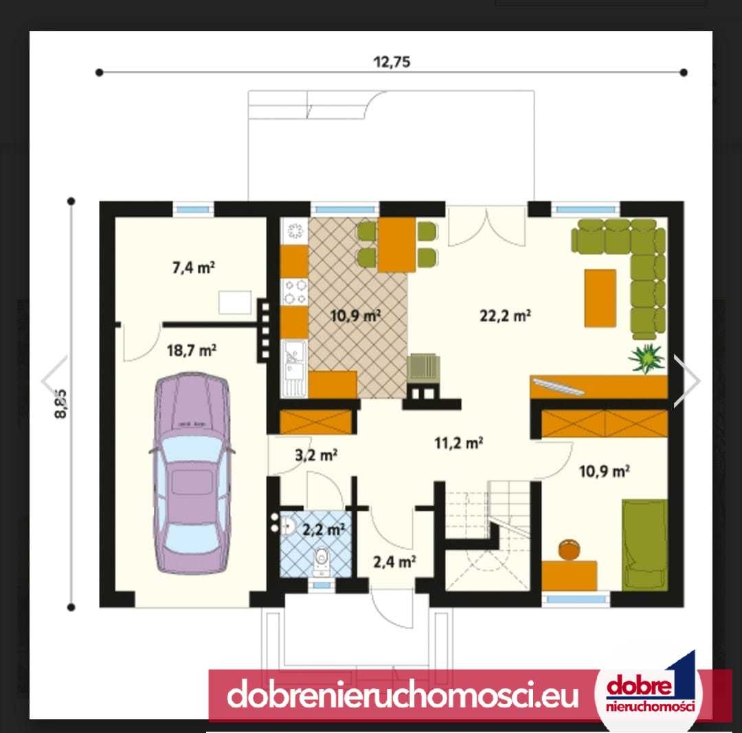 Dom posiada dwie kondygnacje oraz ocieplony strych nieużytkowy. Układ pomieszczeń oparty na popularnym projekcie „Calineczka”.