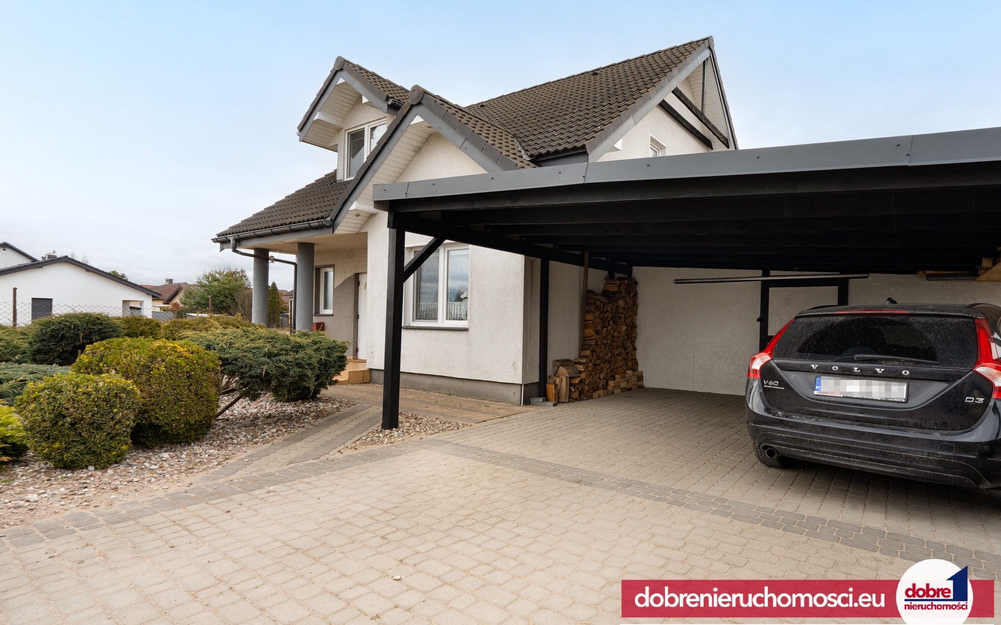 Dom wolnostojący z dobudowaną dużą wiatą na samochody,